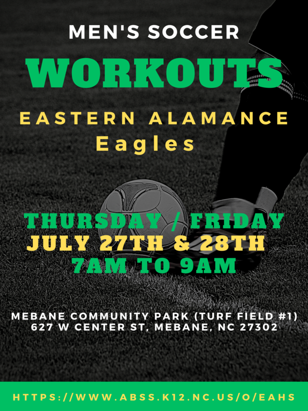 Come to workouts on Thursday & Friday (July 27th & 28th) from 7am to 9am. Our Eagle coaches will be on turf field #1 at the Mebane Community Park located at 627 W Center St, Mebane, NC 27302.